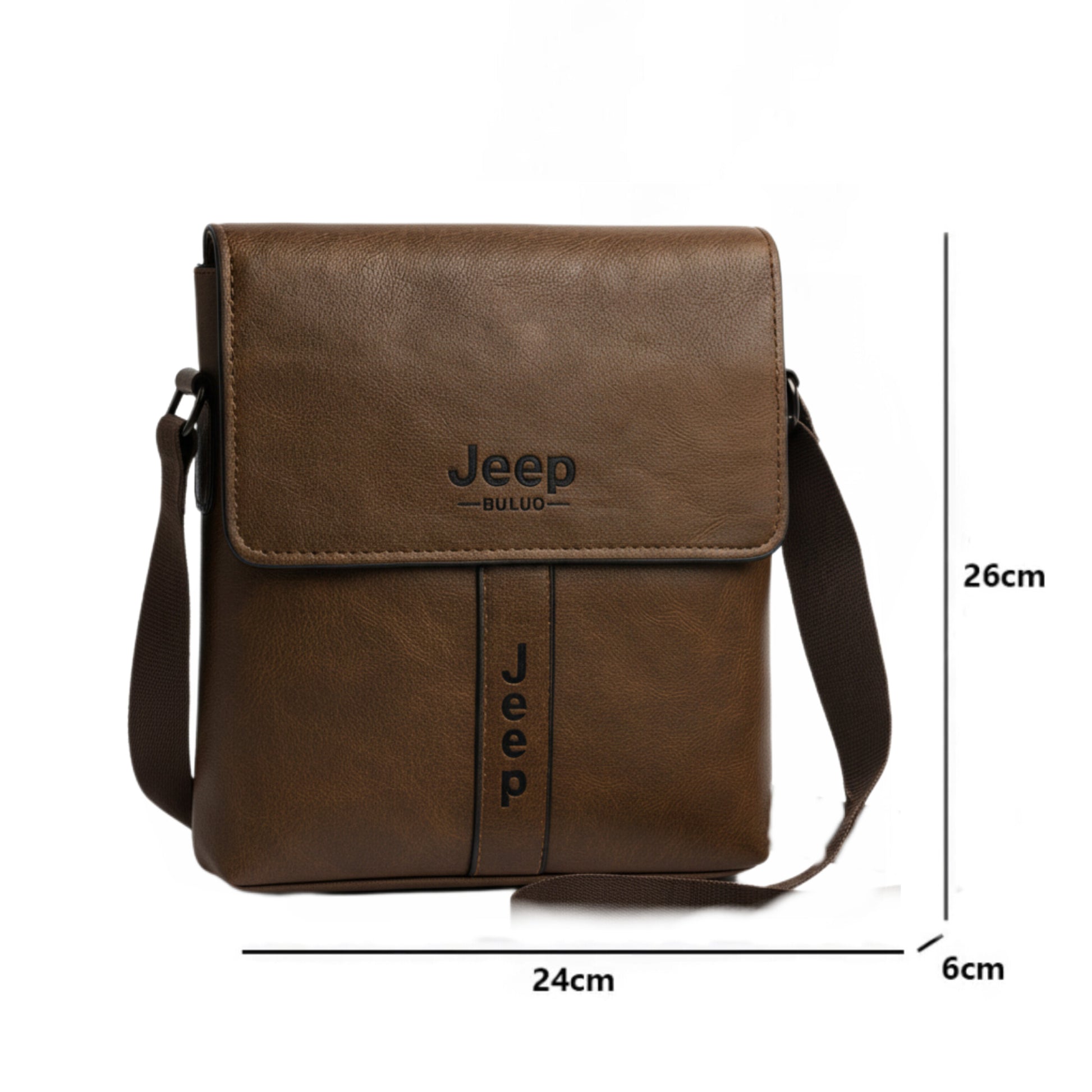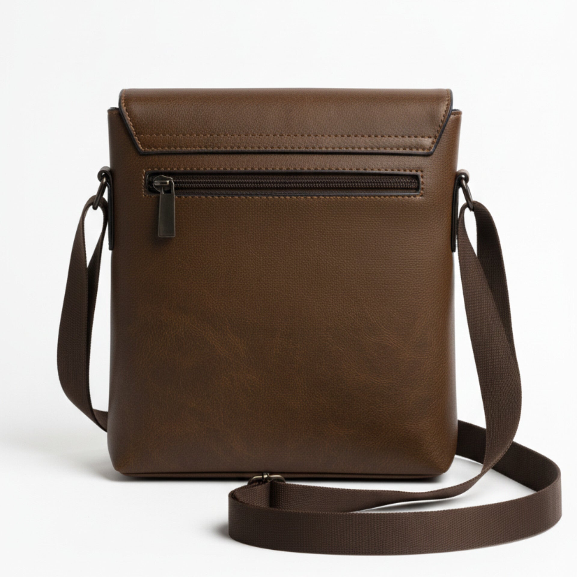Stylish brown leather crossbody bag with adjustable shoulder strap and secure back zipper pocket. Compact yet practical (26×24×6 cm), ideal for daily essentials.